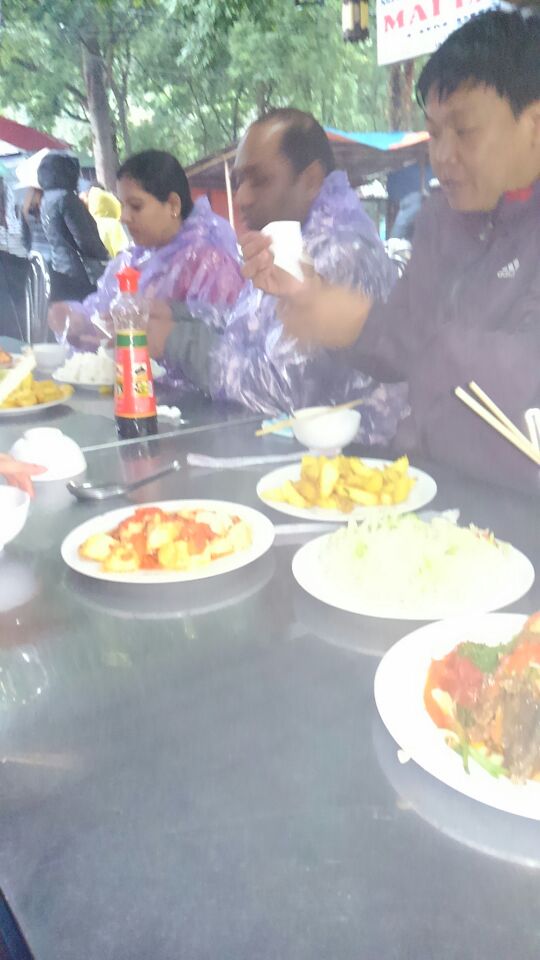 ぎっこりギッコリ艪を漕ぐオールの音に揺られ、寒さも忘れて周辺の景色に見とれていたが、1時間程川を上ると、目指す目的地「パゴダ寺院」の船着き場に到着した。参詣者は小舟でしか来られない。陸上の道はどこかにあるかも知れないが、関係者以外は通れないのだろう。船着き場の直ぐから土産物店が並んでいて、その正面にパゴダ寺がある。土産物店の中程に大きなレストランがあり、観光客、参詣者は皆ここで昼食を摂るようだ。食堂はここに1軒しかない。朝ハノイを出てくると、丁度昼近くになり、食事の時間だ。