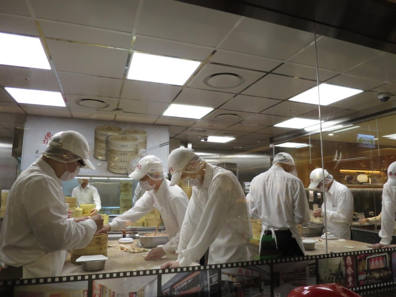 ガラス越しにせっせと小籠包を包む人たちが見えます。 -