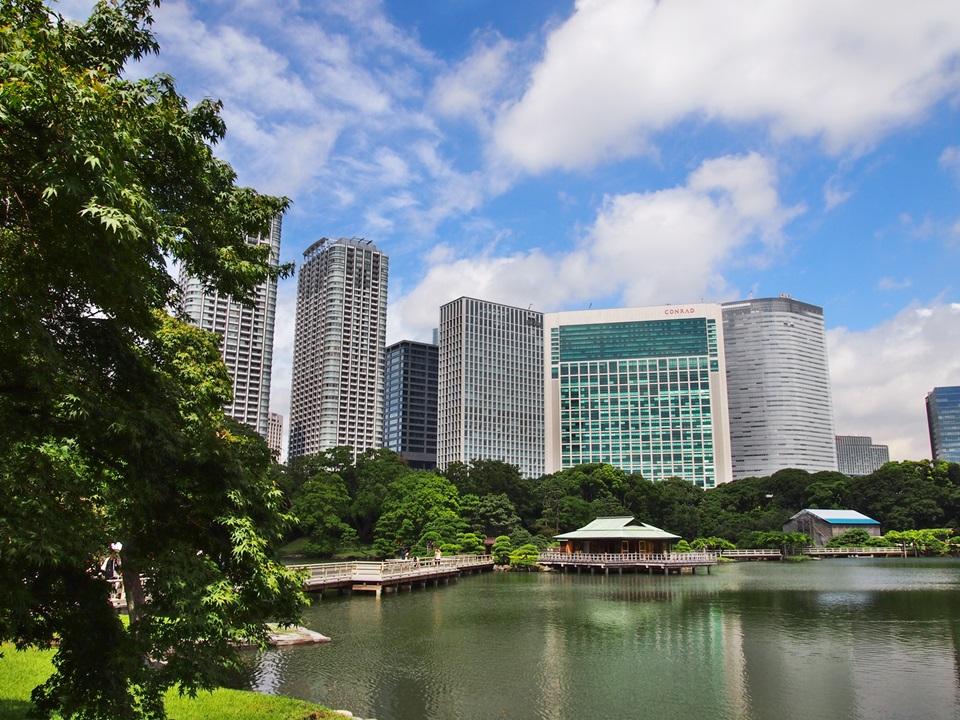 浜離宮恩賜庭園は、潮入の池と二つの鴨場をもつ江戸時代の代表的な大名庭園。潮入の池とは、海水を導き潮の満ち干によって池の趣を変えるもので、海辺の庭園で通常用いられていた様式です。