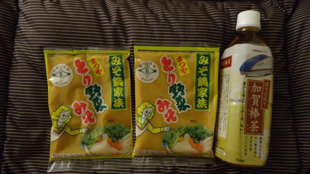 お土産の「とり野菜みそ」と加賀棒茶です。とり野菜みそは石川県民のソウルフードらしく、先日の秘密のケンミンショーでも取り上げられていました。