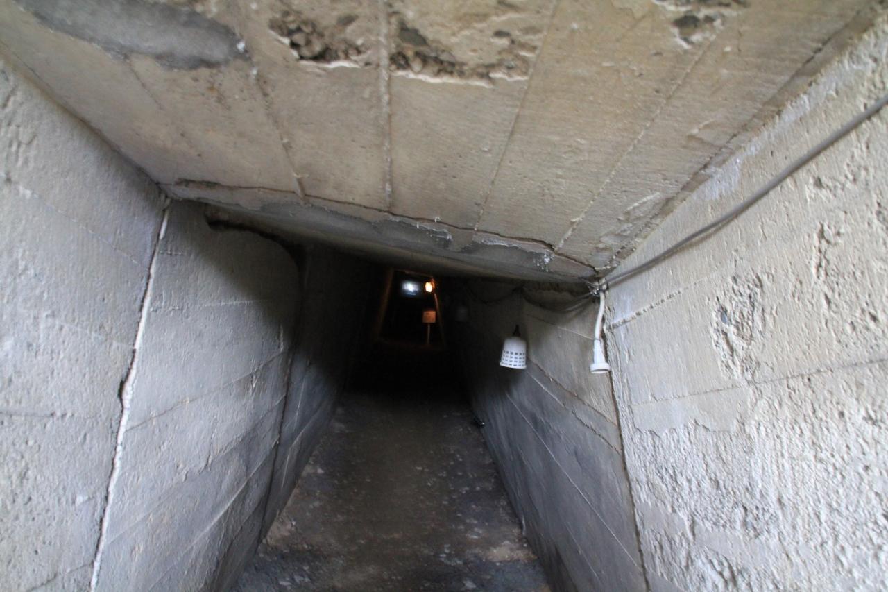中は約20mくらいのトンネルが送まで伸びており、終端近くにある左側の横穴を入ると、大きなドーム屋根のコンクリートの部屋があります。この部屋の手前にも少し小さな部屋があり、また入ってきた通路の反対側にもう1本のトンネルが、入ってきた穴と平行で付いています。