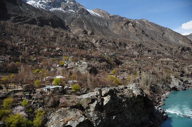 緑の畑とインダス川の青、アンズの花のピンク、そして背後に雪山という素晴らしい色のコントラスト。 -