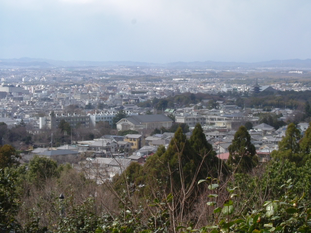 正面の山が生駒山。中央左にテレビ塔があり、テレビ塔の左手に唐招提寺が見えるとのことなのですが、分かりますか? -