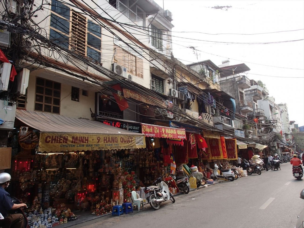 市場の裏手の路地を進んでいくと暗闇の中にいくつものリアカーが路上に点在していて商売をなさっている。ちょっと凄い世界。更に進み、ハンチェウ通りに出たら左折すると東河門があります。旧ハノイ城の門の一つだそうです。