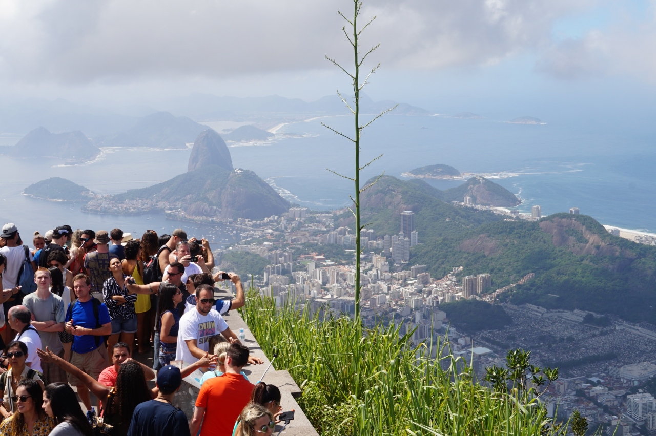山頂のキリスト像に感動のご対面。。。。キリスト像の高さは台座を含めて38m、広げた両腕の長さは28mにもなります。午前中の早い時間に到着したのに、山頂は既に一杯の人・人・ひとです。