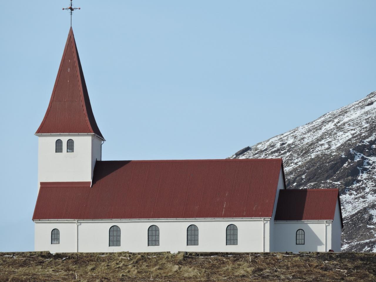 雪山の左側に小さな教会(スカウルホルト)が見える。