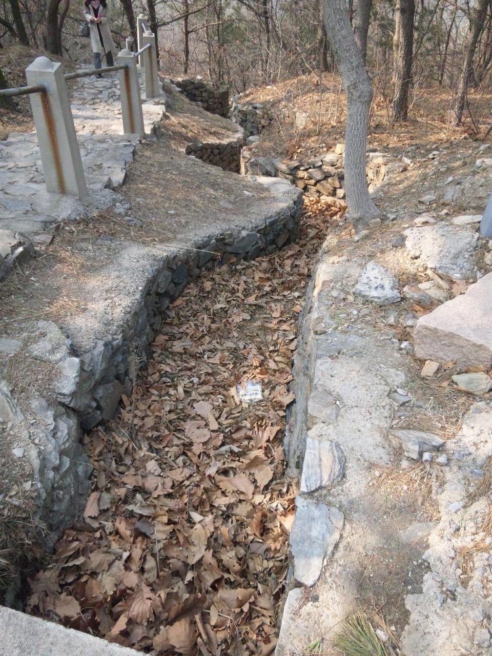 銃弾の跡のある堡塁がずっと続いている所。