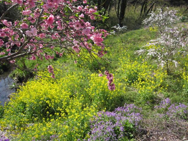 秩父鉄道樋口駅を出るとハナモモ、菜の花などが道端に咲いていました。 -
