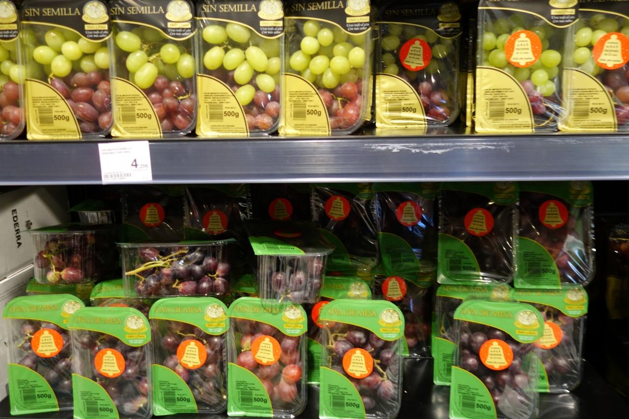 年越し用のブドウが大量に売られてるよ!パッケージにも鐘の絵が描かれている。