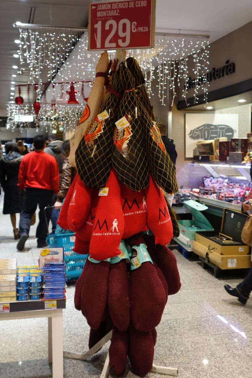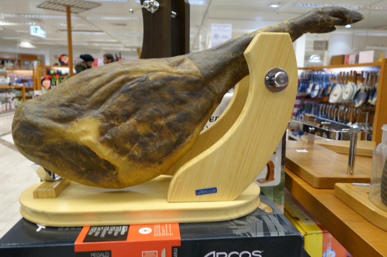 日本では考えられない大きなハムが売られている。すごい!それに1本129ユーロって超々格安じゃないか?1本欲しぃ〜!