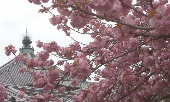 上から眺めた八重桜と南円堂、桜が咲いていいながめですね♪