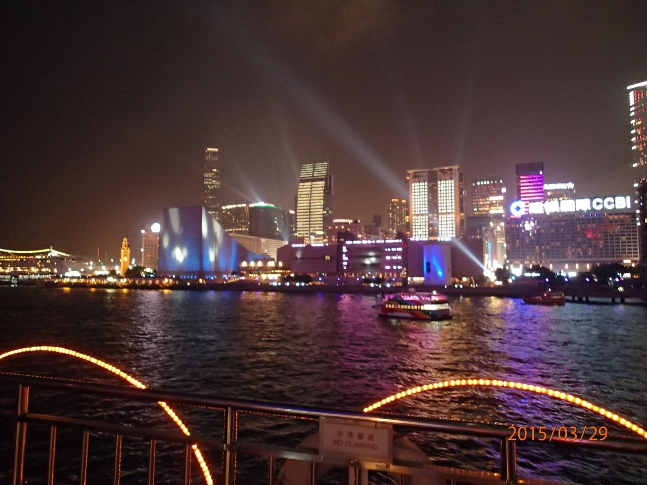 女人街散策後フェリーに乗りシンフォニーオブライツ鑑賞。テーブルは決まっておりビッフェ形式。焼肉は開始15分で売り切れ。ムール貝とスモークサーモンがとてもおいいく食べあさってました。アルコールソフトドリンクは有料。チンタオビールで4.5香港ドルだったかな?このあとはホールでダンスで終了です。ホテルに帰ったのが22時頃でした。結構お得なツアーでした。