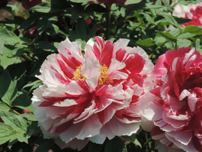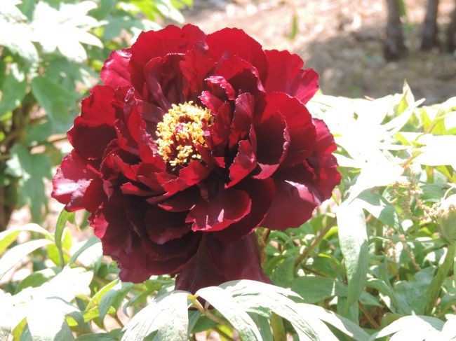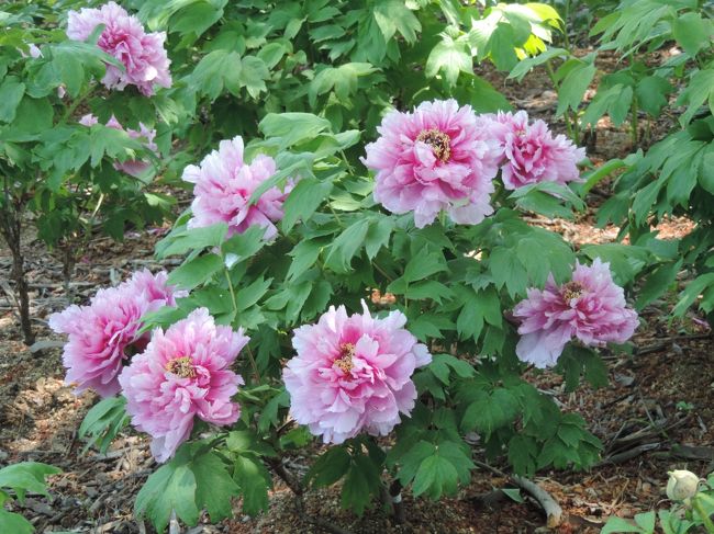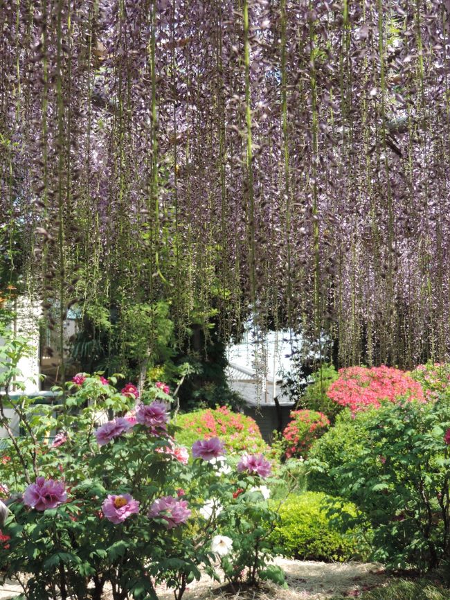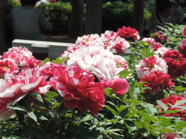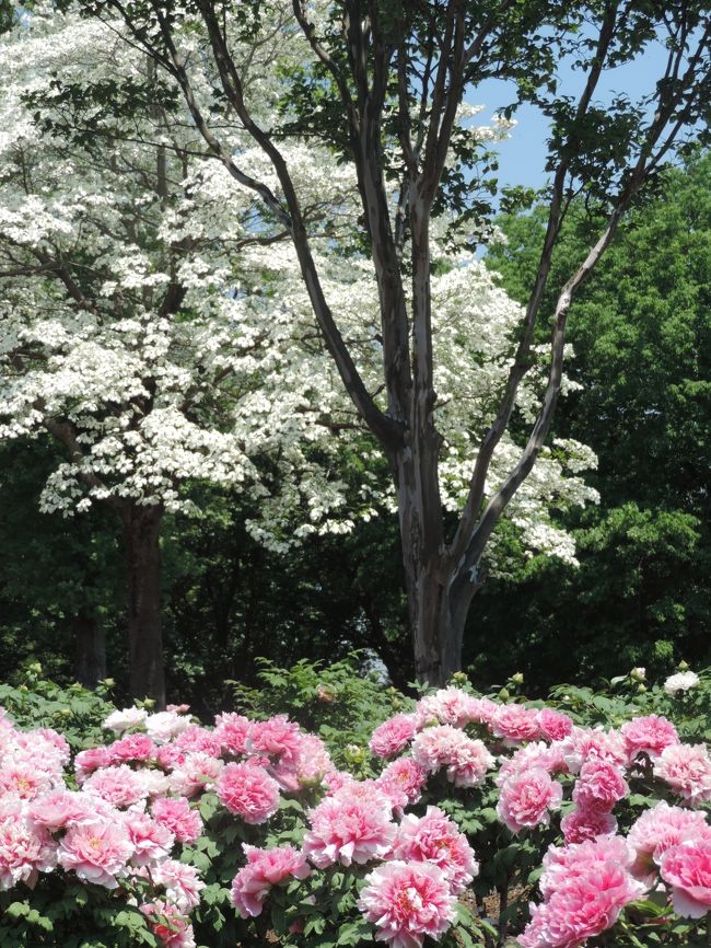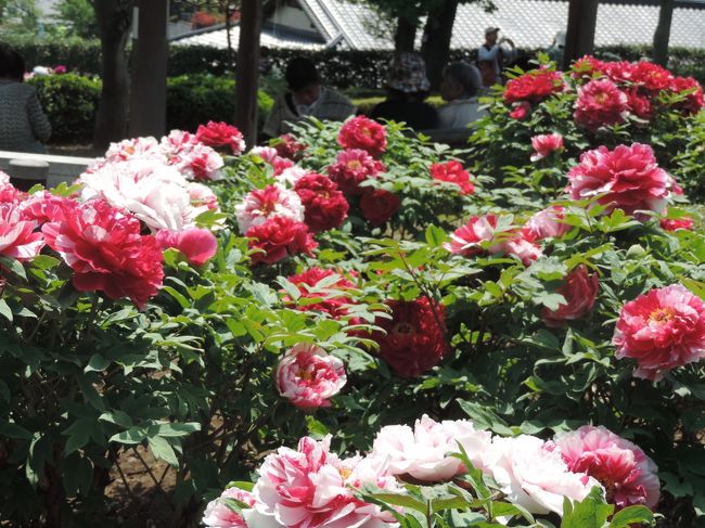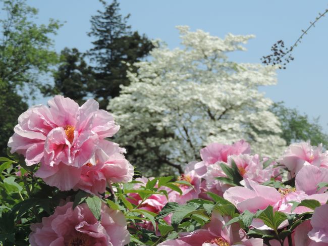 東松山市の市花は牡丹である。まず駅近くの箭弓(やきゅう)神社の牡丹園へ。千株の牡丹、藤、つつじが全て満開で実に美しい。駅に戻ってこの時期だけ運行しているバスで東松山ばたん園に行く。10分で着いたぼたん園は9000株の色とりどりの牡丹が咲き誇り、新緑の山々と、真っ白なハナミズキが見事な背景になっている。
