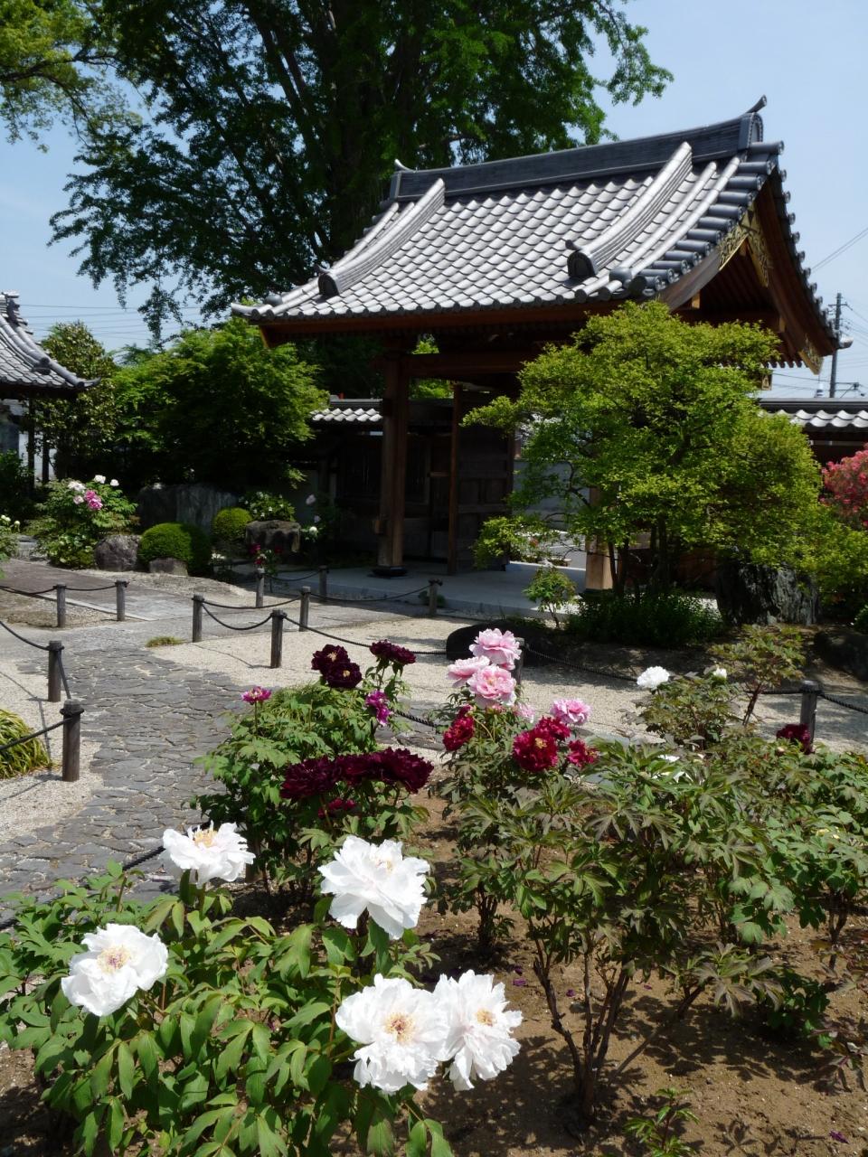 山門から左に続き、南側に回り込んでいる袖塀が立て替えられ綺麗になっています。その袖塀の外側にもボタンが植えられています。塀の外のボタンの花は、多くはありませんでした。恩林寺 寺・神社・教会