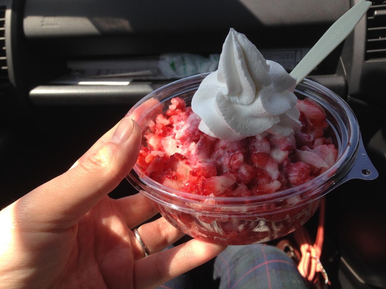 凍らせたイチゴをかき氷機で削って,練乳と生クリームを載せてくれます。
