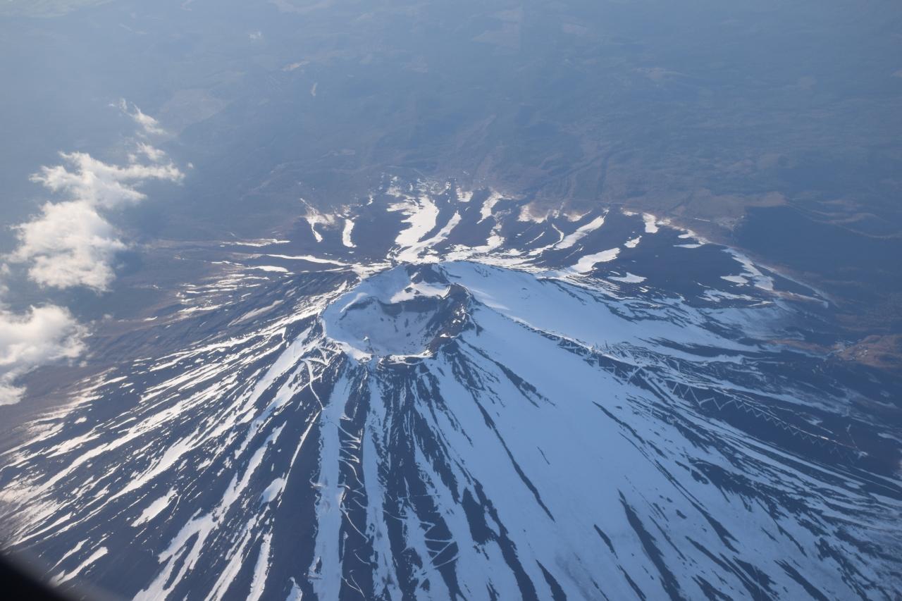 阿蘇の上空に来ると、噴煙を上げる姿が間近に。風向きによっては航空路にも影響があるようです。この日は定刻通りでした。