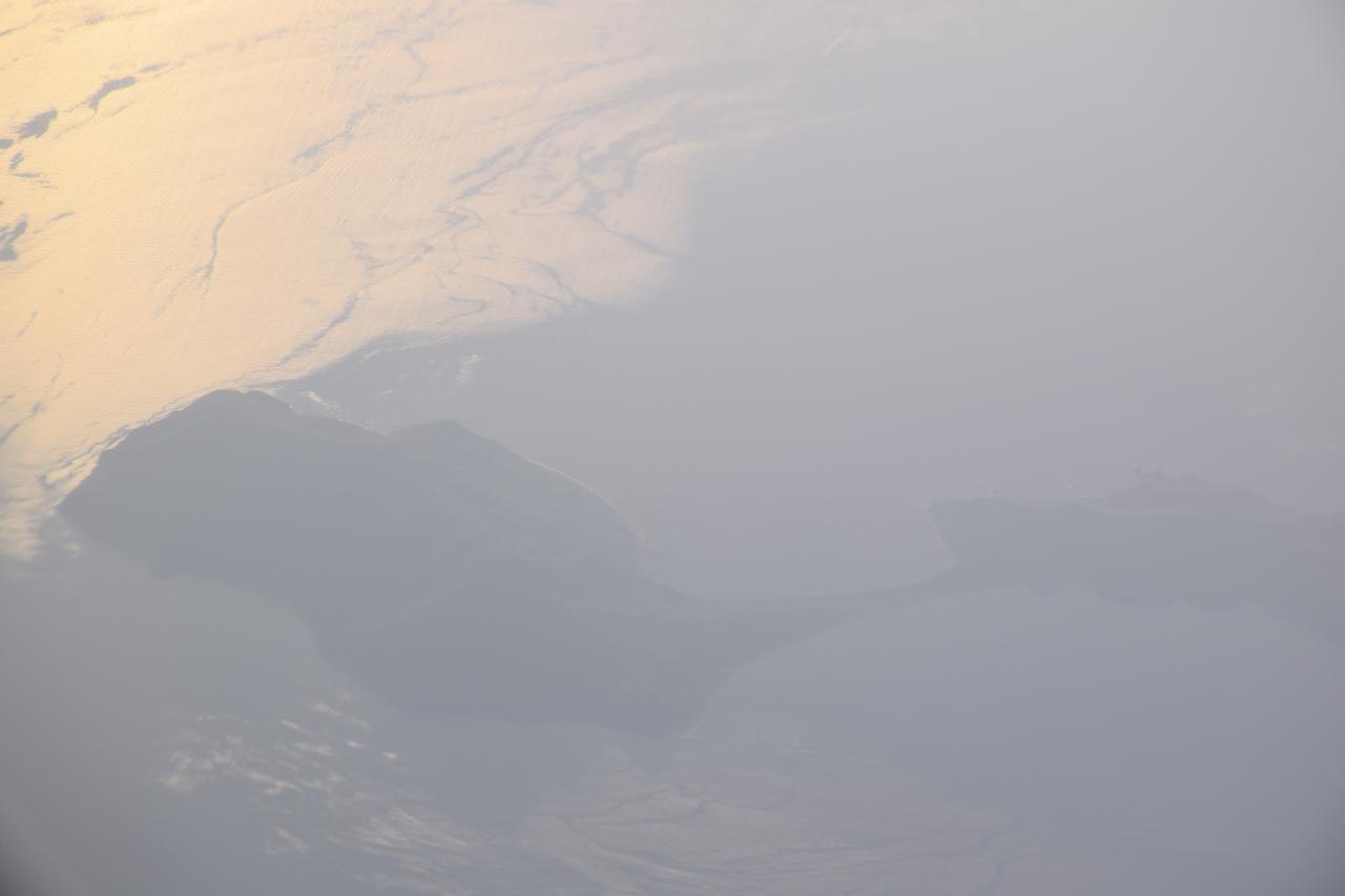 瀬戸内海上空です。夕陽に島影がシルエットのように。