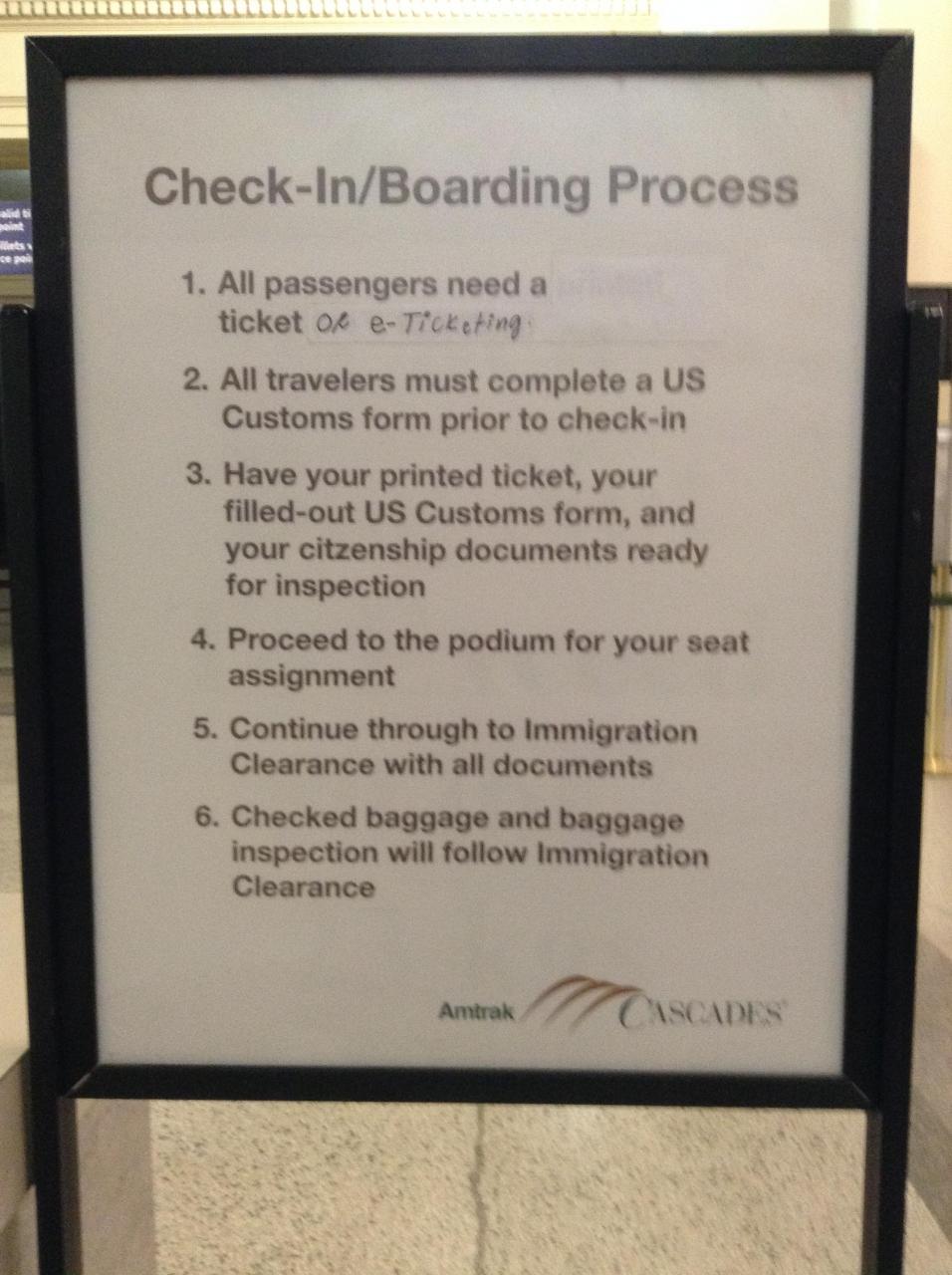 アムトラック乗車時にカナダ出国、アメリカ入国手続きを行います。事前にESTAは取得してあります。US6ドルを支払いました。友達の家に泊まると言ったら、友達からのメールをよく見ていました。アジアのゆるーい入国審査に慣れていたので、アメリカの厳しさを感じました。が、別に問題もなく無事出国です。以前ハワイに一人で行った時よりはゆるかったです。 -