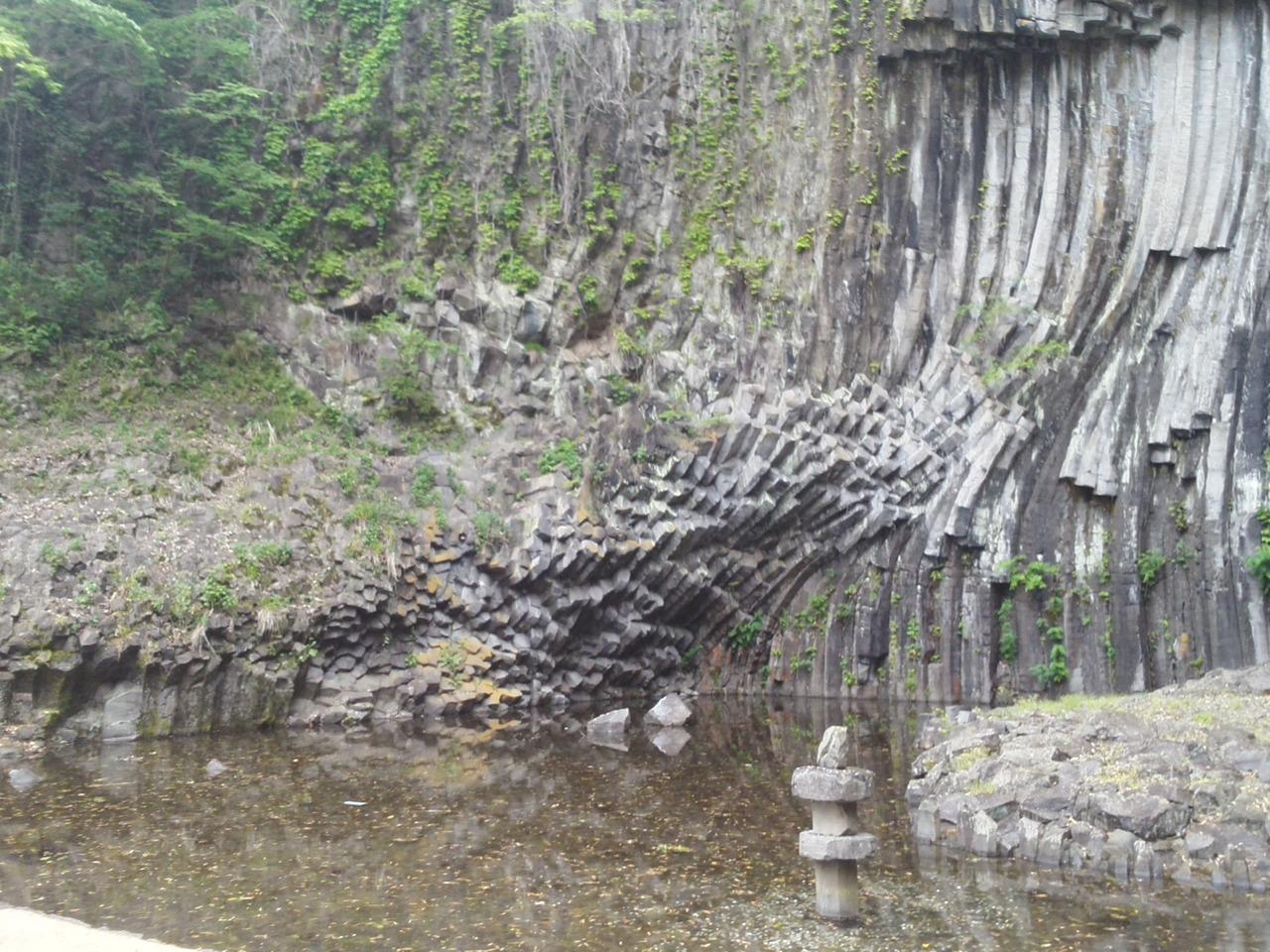 玄武洞は160万年前に起こった火山活動によって山頂から流れ出たマグマが冷えて固まる時に規則正しく綺麗な割れ目を作り出した岩です。6000年前波に洗われて姿を現し人が石を取ったため洞となったもので数知れな六角形の玄武岩(柱状節理)が積み上げられて不思議な美しさを見せています。玄武洞公園には五つの洞が見られます。玄武洞、青龍洞、白虎洞、北朱雀洞、南朱雀洞があり柱状節理がどこも凄いですね!玄武洞公園では「NPO法人玄武洞ガイドクラブの人がガイドしてくれます。