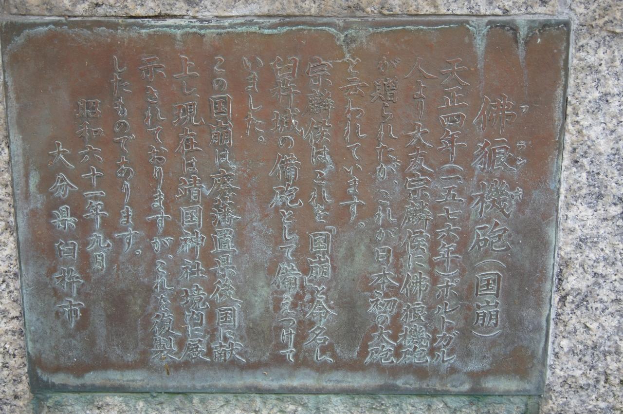 国崩しと呼ばれたフランキ砲のレプリカです。大友宗麟が輸入した日本最初の大砲だそうな。本物は靖国神社に献上されたとか・・・