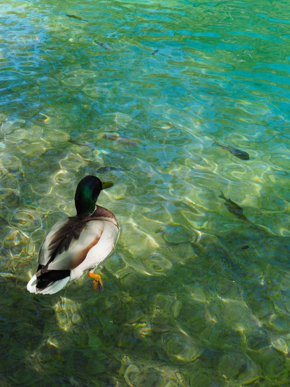 鴨が泳ぐと、水の流れが出来るからか、その後をマスが着いて行く。