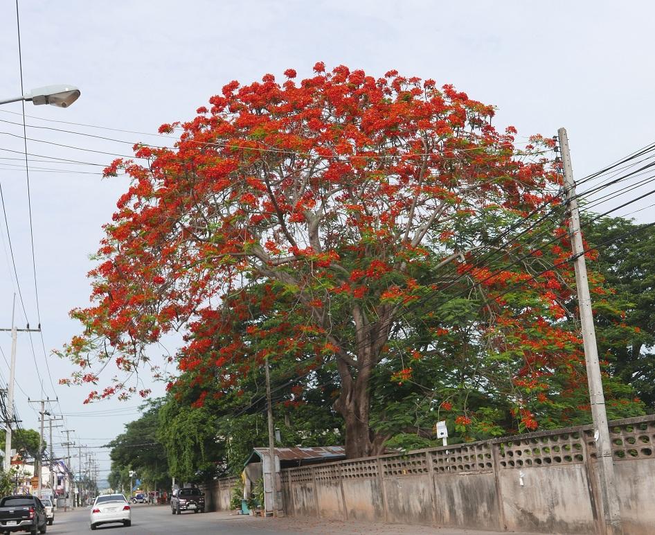 朝8時出発です 4月の旅ではゴールデンシャワー(ドッ.クーン)が咲き乱れていましたが5月は写真の花ハーン.ノック.ユーン です。今回の旅行でも各地でその美しさを披露していました。ここはBさんに車を止めてもらい下車してパチリ。