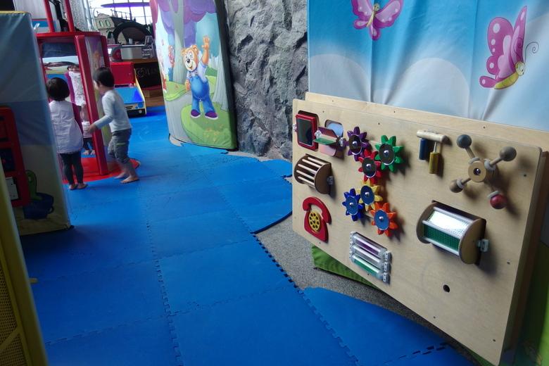 無難にブロックとペダルカーコーナーへ。でもこの足蹴りコース、アップダウンがけっこうあって足の力が強くないと登れない。うちの5才と3才は、手助けがないとコース一周できなかった。