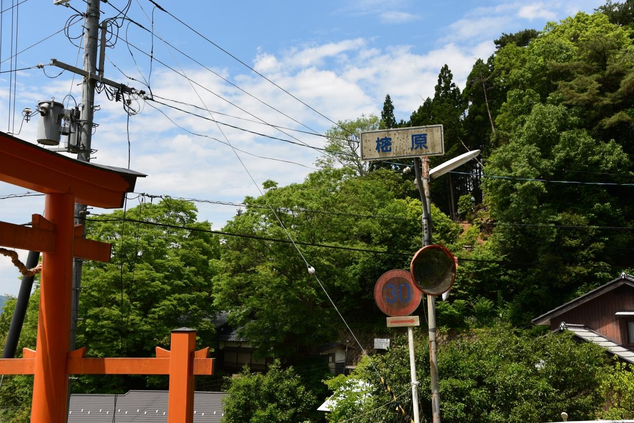 また、修験道の行場だった愛宕山に鎮座する愛宕神社の裏参道が樒原へ通じており、集落に面して一の鳥居が立っています。