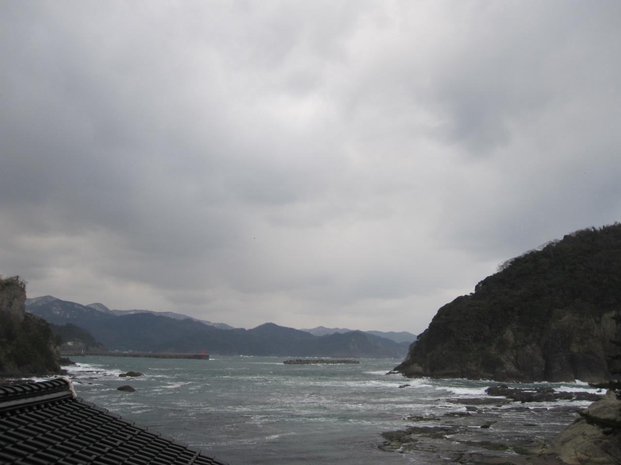 お部屋からの眺めです。夕日百選に選ばれた海岸ですが、あいにくの曇り空なので、残念でした。冬の日本海は曇りがちなお天気が多いです。