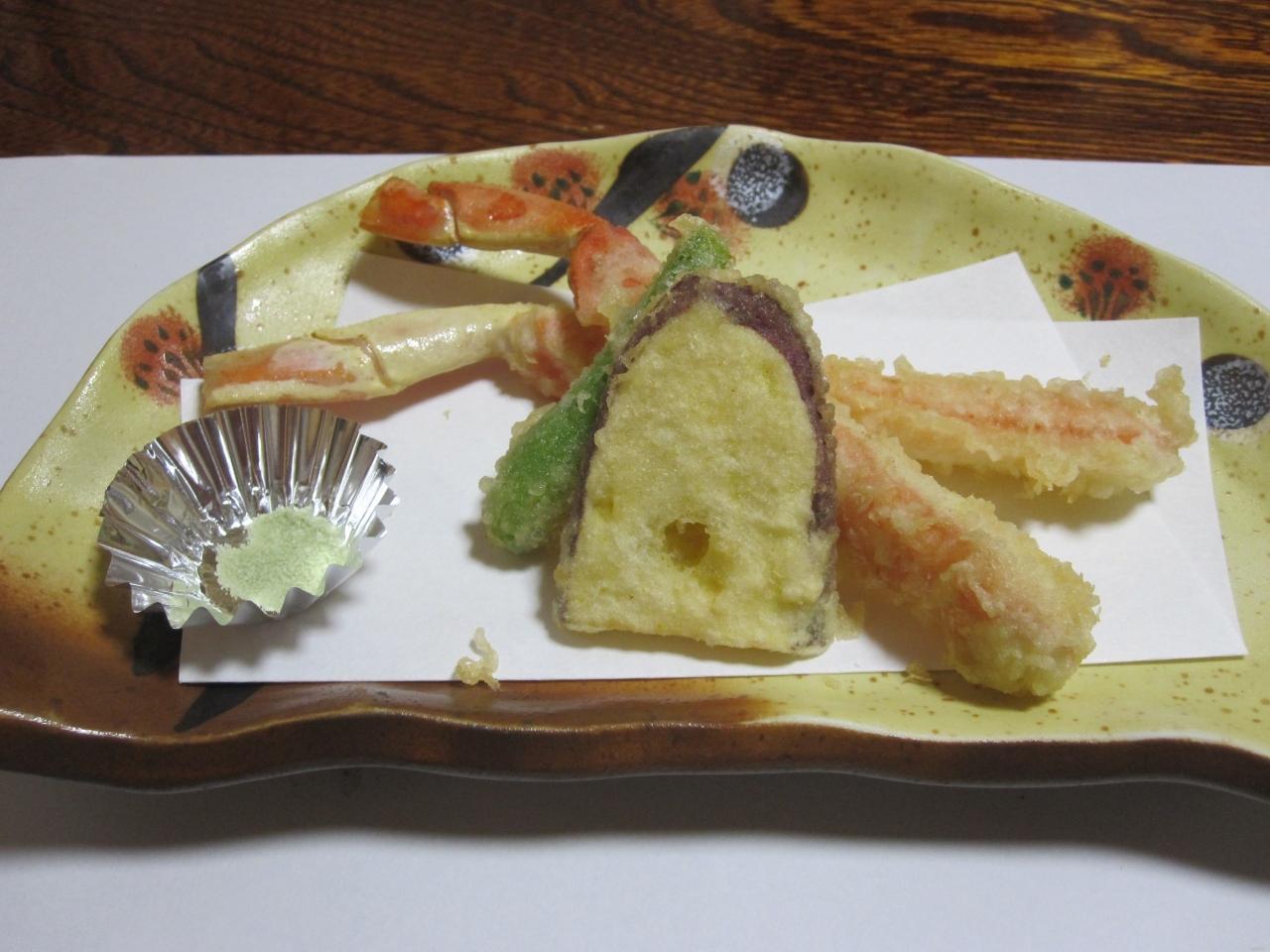カニの天ぷらは大好物です!ふわふわでおいしいです!抹茶塩で頂きます。