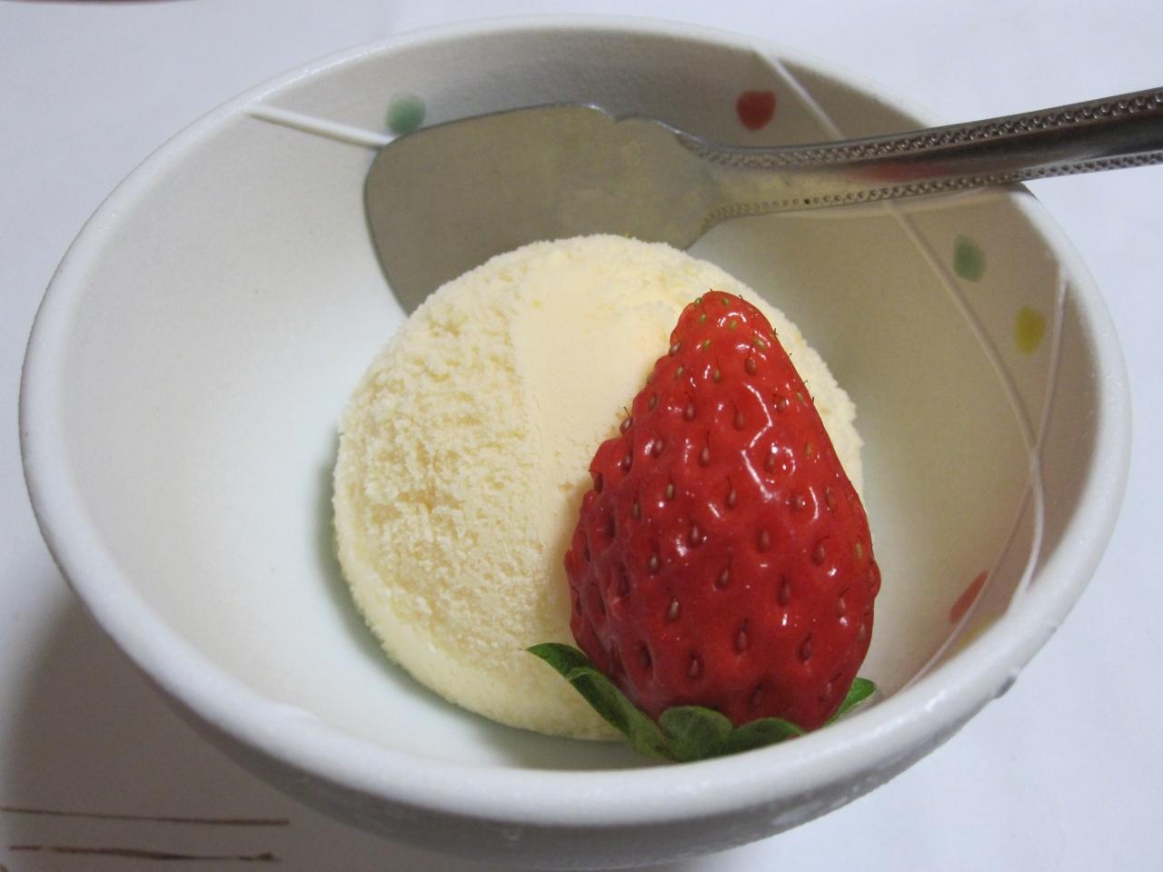 デザートのバニラアイスといちごです。いちごがすごく甘かったです!