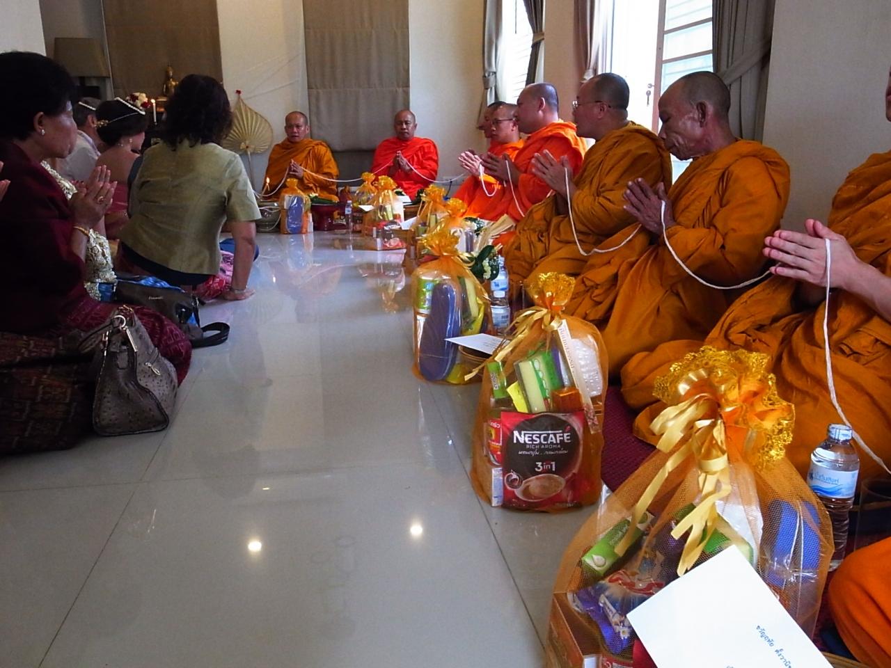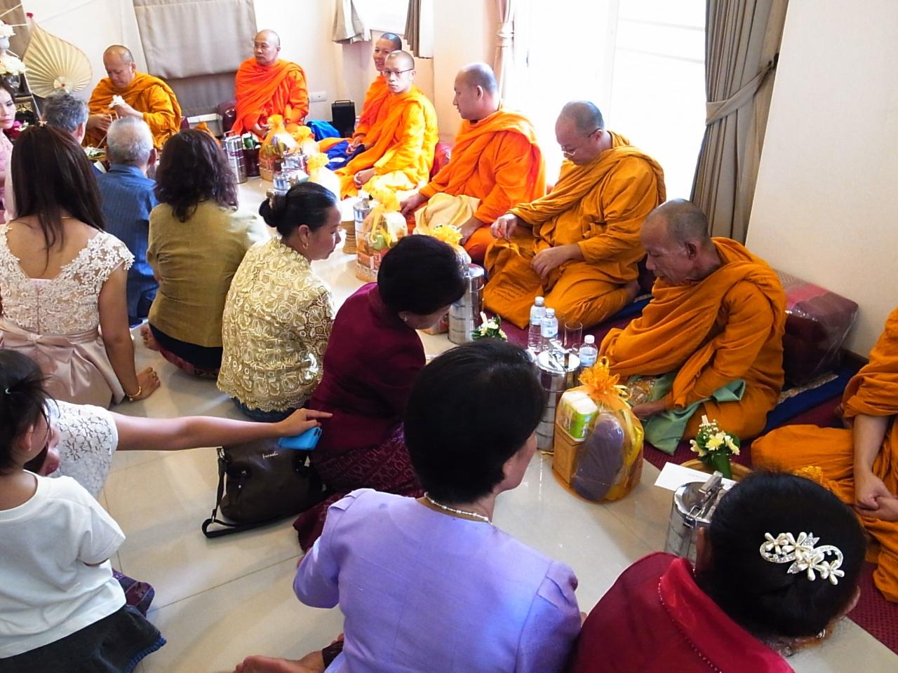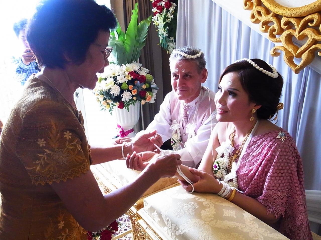 参列者が次々に、二人の手首に白い紐を結ぶ。