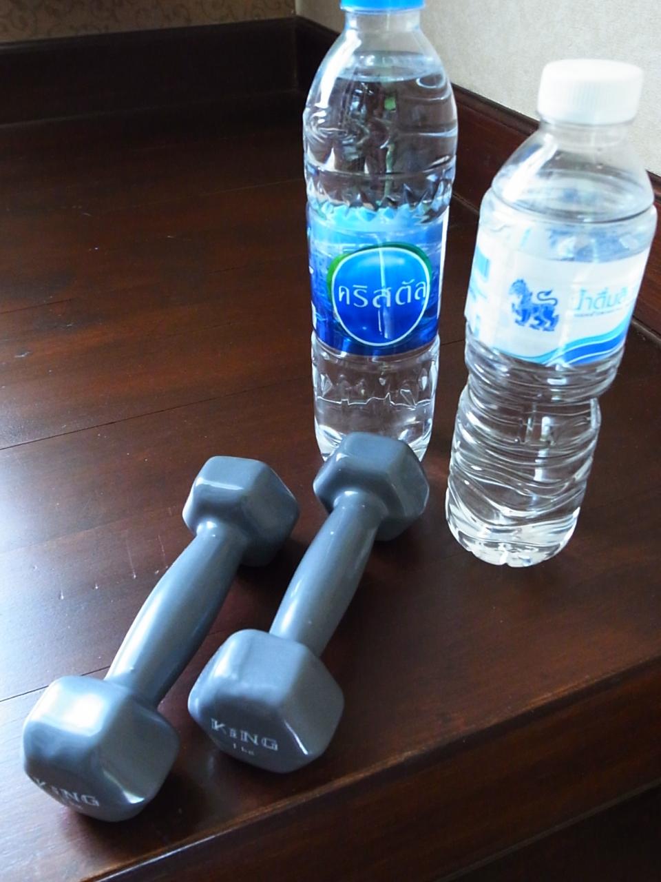 医者から500g以上の物を持たないようにいわれ、ペットボトルを持ってリハビリをしていたが、最近1?のダンベルを購入して次の段階の準備。 -