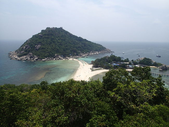砂州の白がきれいですね。向こうに見える山のてっぺんが、ナンユアン島のビューポイントです。山の手前を半周ぐらい左手に歩いて行き止まりから急な山道を登っていきます。途中、プライベートコテージがありますが、もちろん進入禁止です。