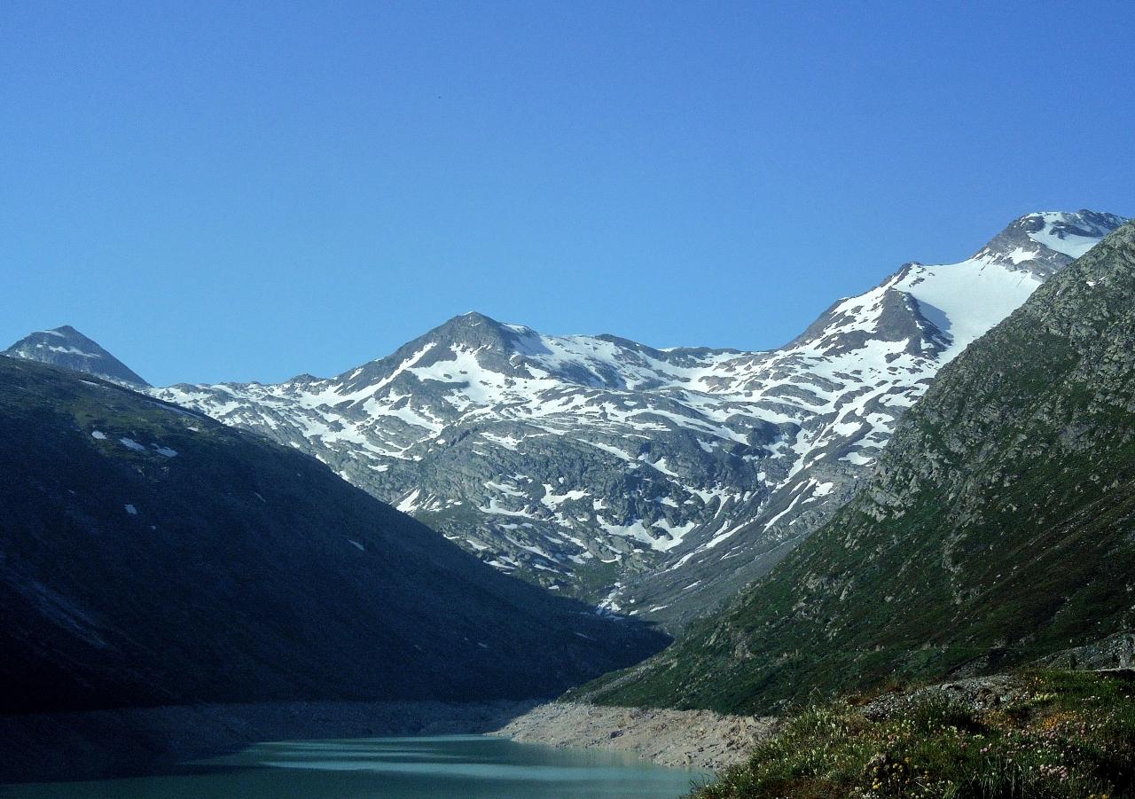 歩いてきた方向、遥か遠方にはビーチホルン(Bietschhorn、3934m)がうすく望まれる。左下にはマットマルクのダム湖の左岸、上方の厳つい山はエッギナー(Egginer、3367m)、右側にはミッタ−クホルンも見えている。昨年はこのあたりで進むのを断念、引き返したように思う。