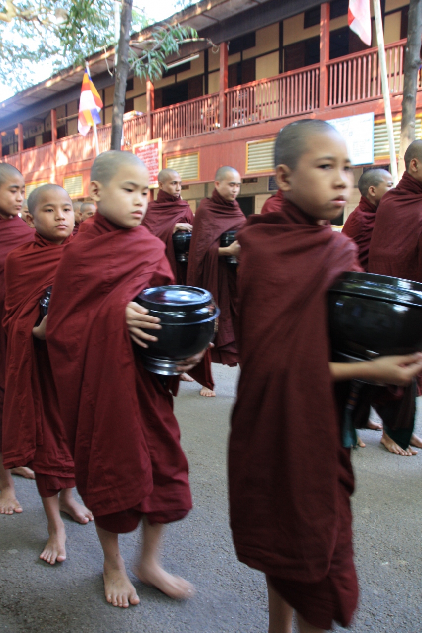 ミャンマーは僧の世界です。国内いたるところ僧院があり托鉢が行われています。