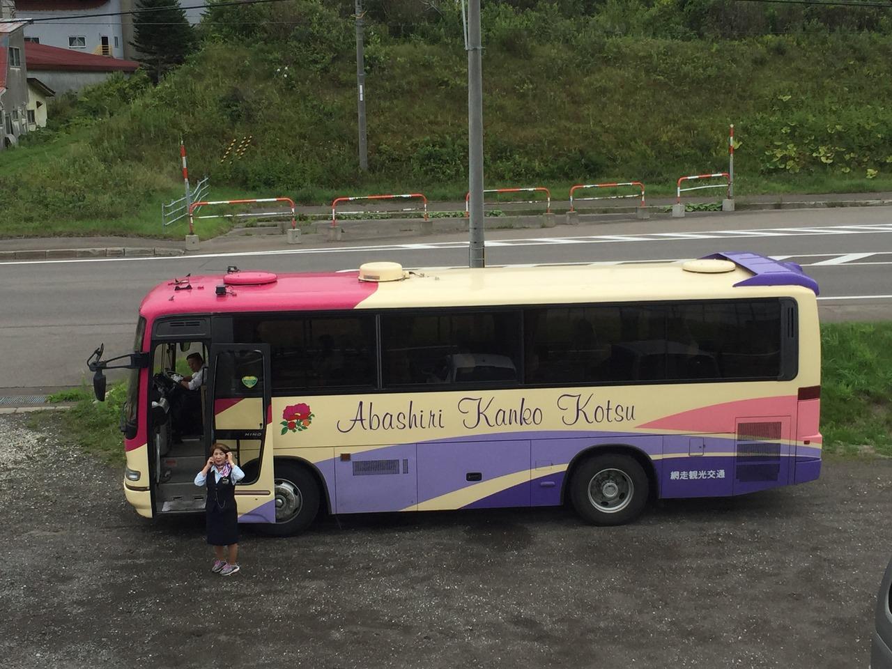 北浜駅近くには展望台があり、写真撮れます。展望台から今回乗車のツインクルバス。網走観光担当。