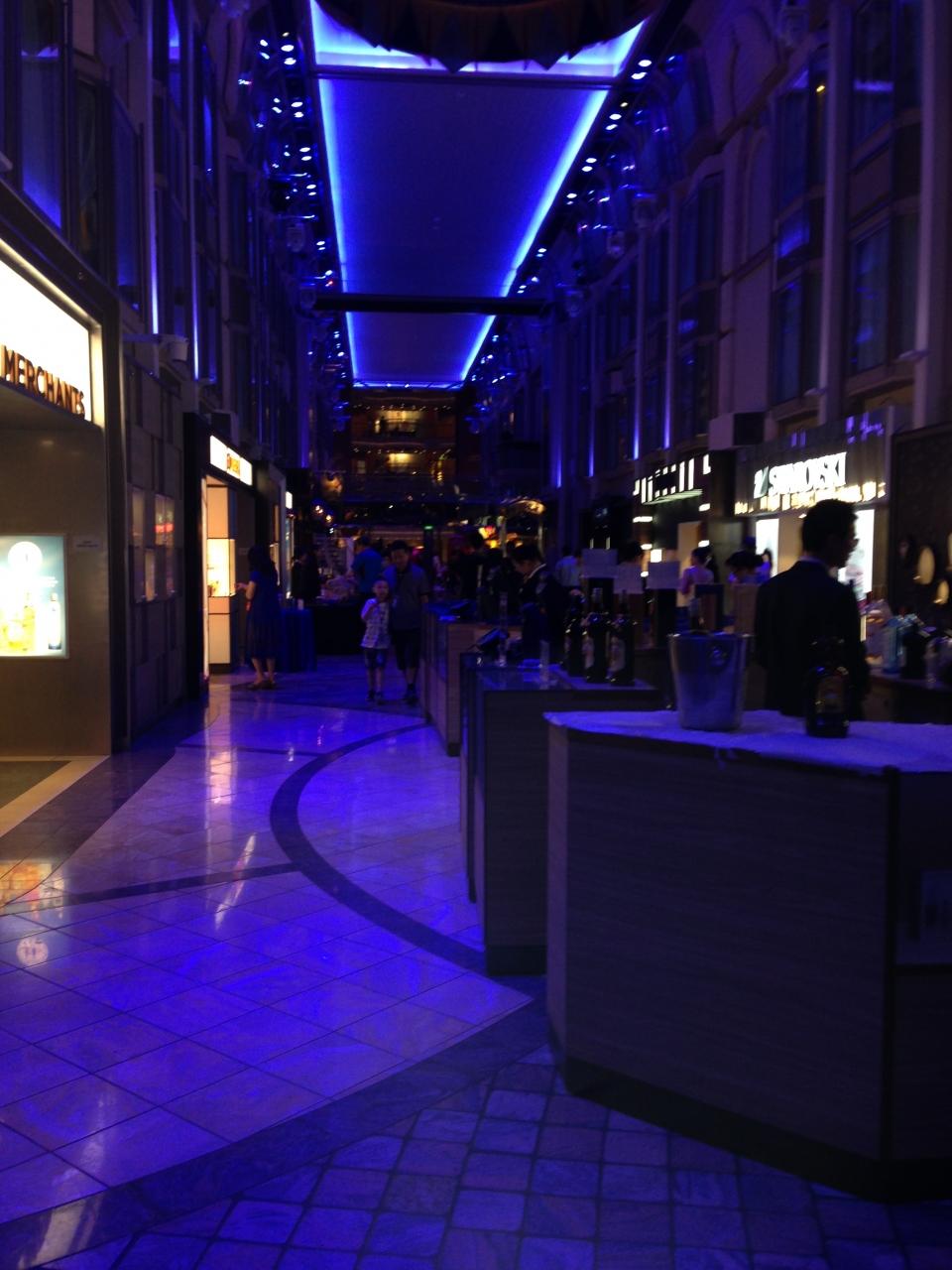 船内のプロムナード。宝飾店、カフェなどあり。日用品はない。
