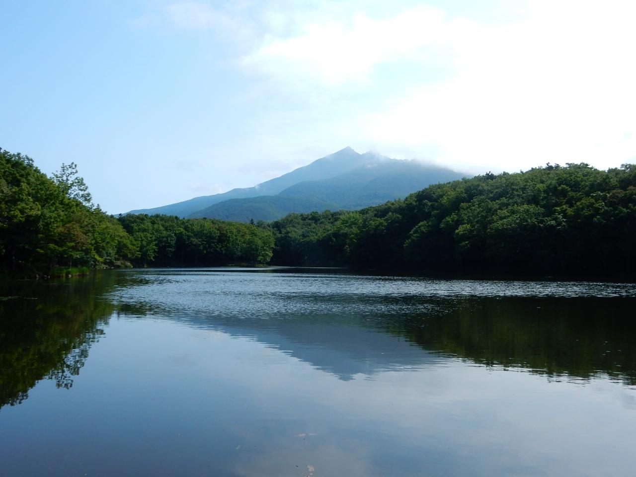 緑が美しいですし、雲が湖面に映っていて美しいです。これが羅臼岳だったらもっと幻想的になります。