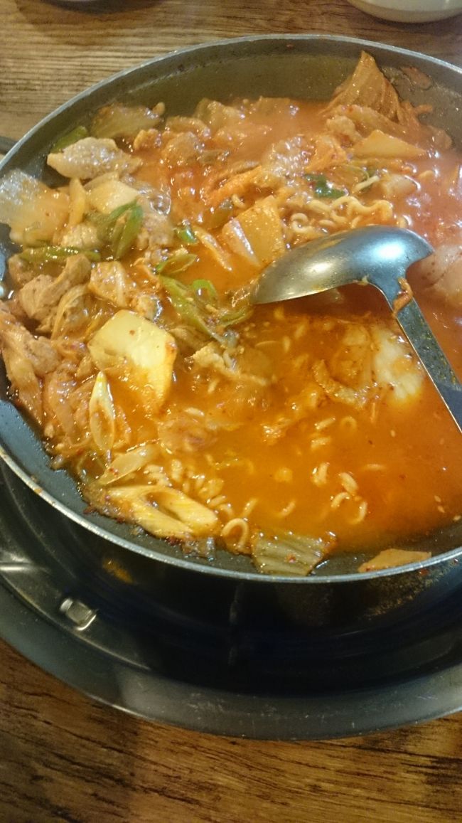 この店 韓国館のは 豆もやし とうふ 豚肉 サンマ ツナ ソーセージ スパム チュクミ(イイダコ) 入り !( ̄□ ̄;)!! 100円の 違い だけで‼ お得 お得 しかも これが また 美味い! 200円で 豚肉 追加しましたよ(^-^)