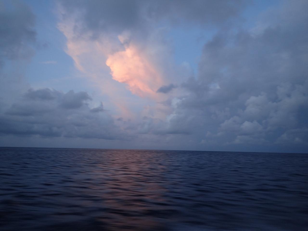 夕日が雲の向こうで、オレンジの優しい光を放ち、海を淡く染め始めます。