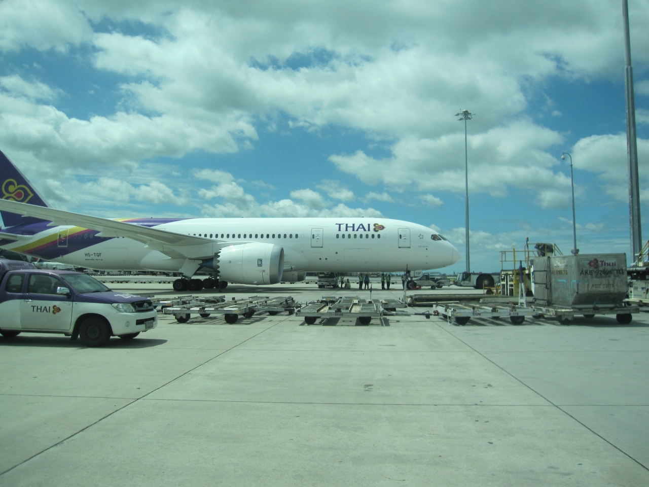 航空会社はタイ航空、バンコク乗り継ぎ。コスト削減のため、直行便は使いません。