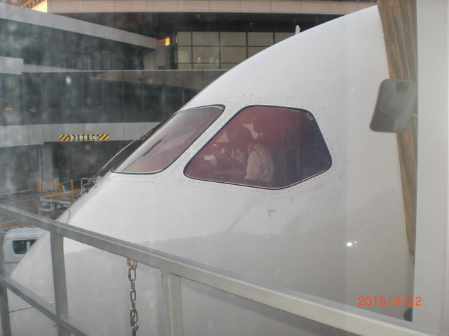 窓の外は雨がポツポツ降ってました。ボーイング787-8・ANAビジネスCRADLEという最新のタイプに乗りました。行きと帰りが違ったタイプの飛行機に乗れてラッキー