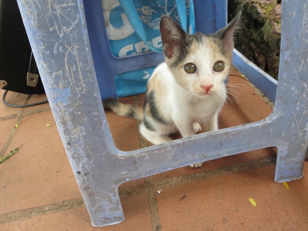 椅子の足にすりすり。とても人懐っこそうで、ここで飼われているのかあ? -