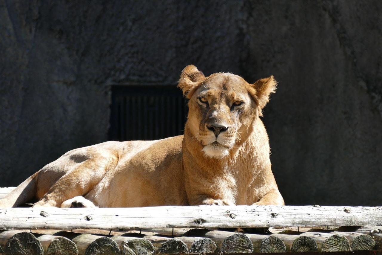 メスライオンはエリアのど真ん中の木段の上、トラのエリアも同じような構成ですが、トラはライオンとの仕切り壁の側に居ました。
