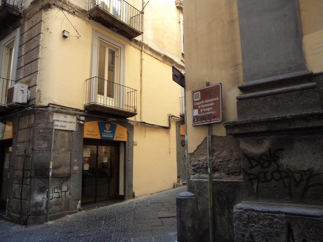 ニーロ像からすぐ近くのサンセヴェーロ礼拝堂。手前の建物が礼拝堂で、黄色の看板のある建物が、チケット売り場。
