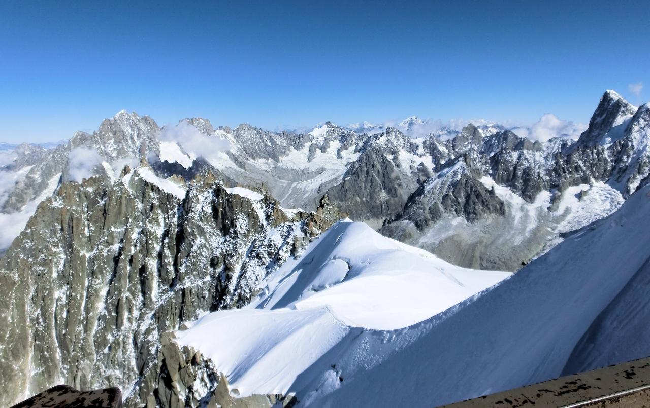 これは、エギーユ・デュ・ミディのシャモニー・テラスやカフェがある所から、さらに上の頂上テラスへ向かう橋からの眺め。