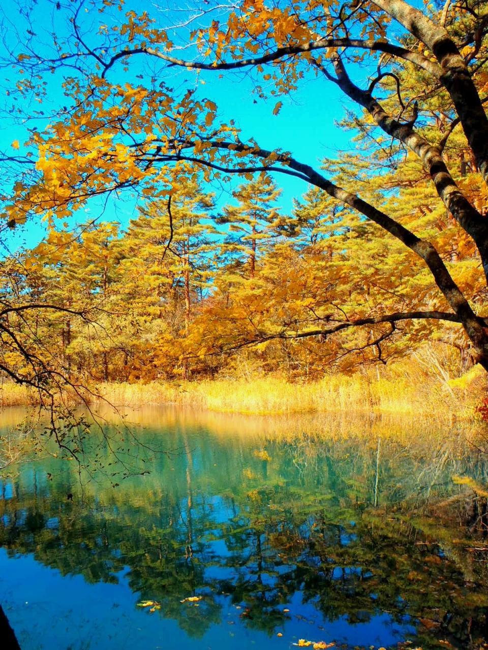 黄葉が水面に映り、鏡のようです。