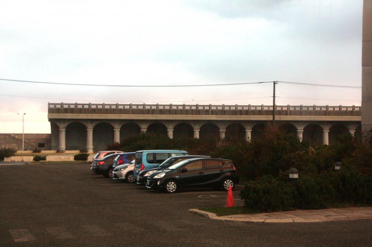 左、稚内ANAホテルと「稚内北防波堤ドーム」全長427m 半アーチ型、70本の円柱が連なり、ローマ建築の回廊を思わせる。道遺産に指定されている
