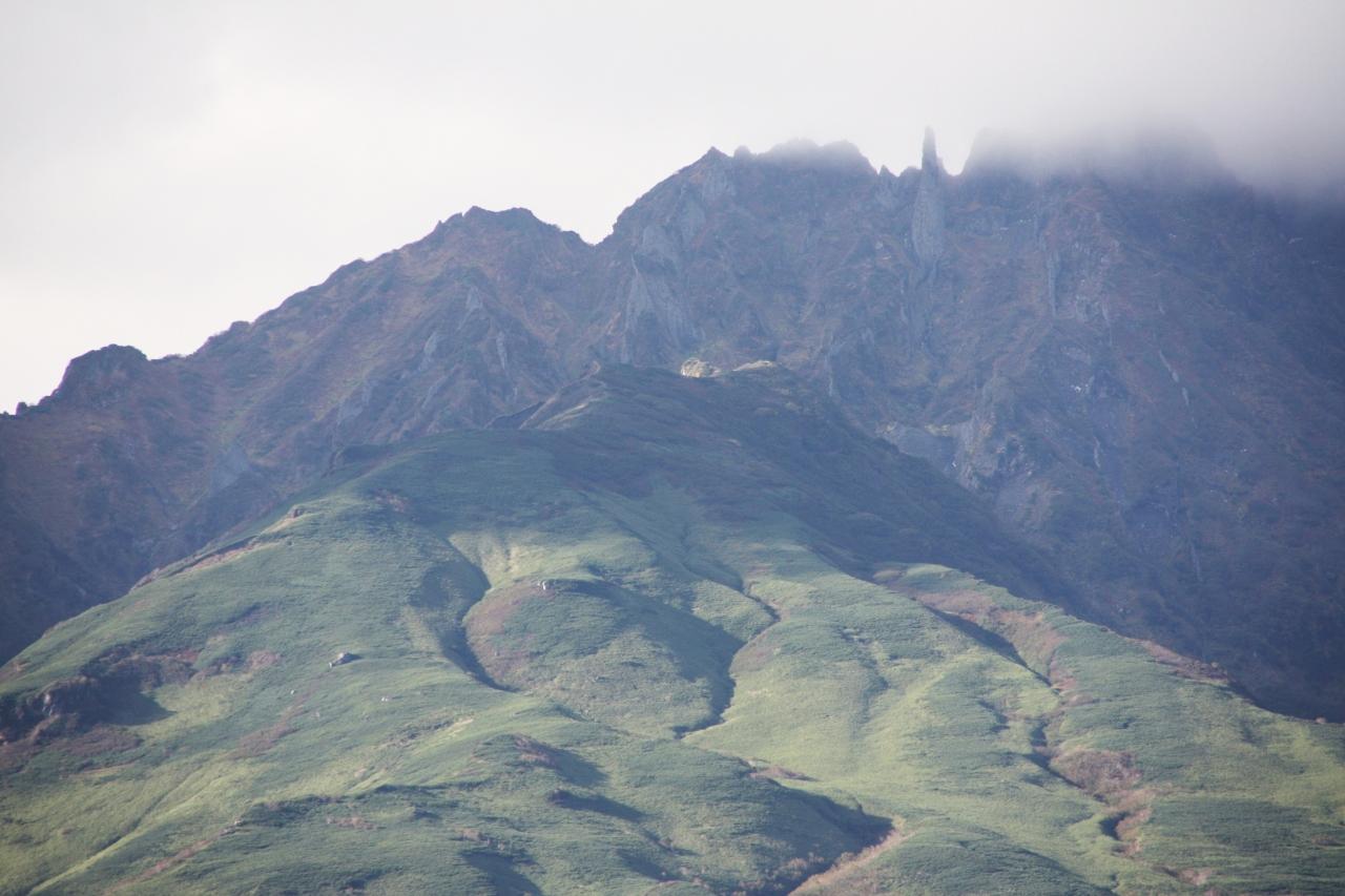 山頂をズーム・・・「利尻山」頂上はガスで視えませんが、直下の”ローソク岩”が見えます!